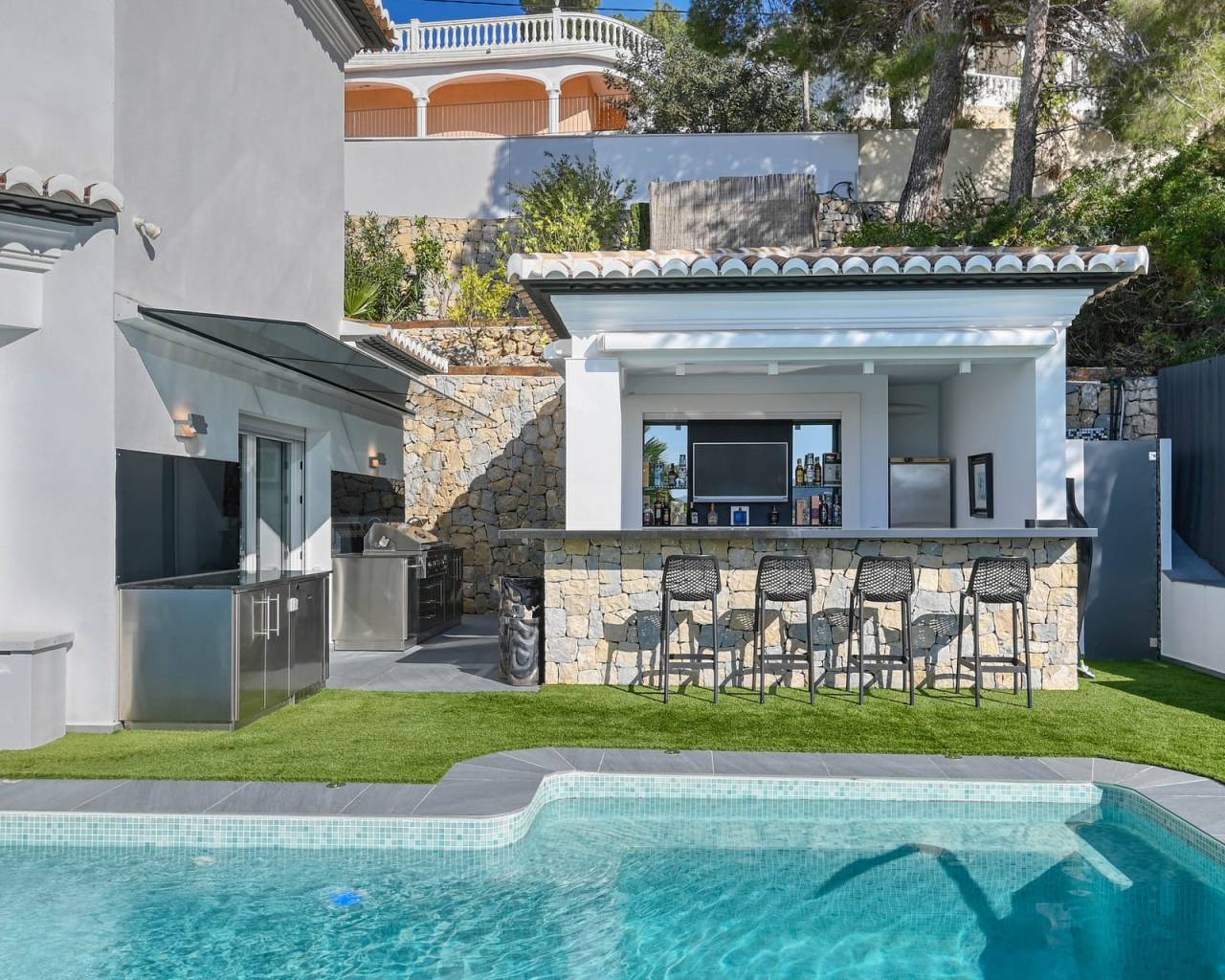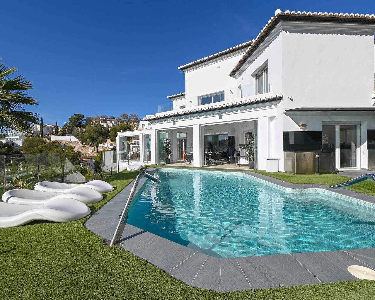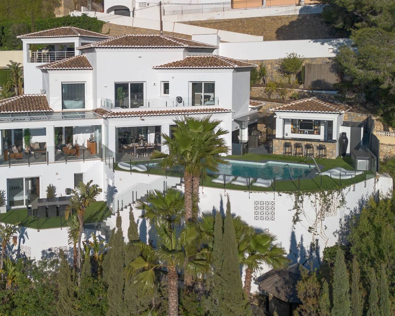 This is a home that makes a statement. Contemporary architecture meets timeless Mediterranean charm. Clean lines, elegant finishes, and thoughtfully designed spaces—creating a balanced aesthetic that feels both sophisticated and inviting. Step inside and the tone is set instantly. Every detail has been thoughtfully curated for those who expect more. The home features five spacious bedrooms, Moraira - Villa each finished to an exceptional standard, complete with en-suite bathrooms and direct access to the outdoors—bringing natural light, air and flow into every corner. Underfloor heating provides quiet, consistent comfort underfoot, while the high-end Lutron system allows you to shape the atmosphere with precision. Fully integrated smart home systems place lighting, climate, and security effortlessly at your command—controlled seamlessly from your phone, whether you’re at home or away. A well-equipped outdoor bar and kitchen invite long, unhurried evenings, while the poolside dining area promises relaxed entertaining in true Costa Blanca style. The exterior lounge, complete with an electric roof, adapts effortlessly to the moment creating a refined space for conversation, comfort, and effortless living. This Moraira - Villa is not simply a property. It’s a quietly confident expression of taste, technology, and lifestyle. Property Highlights Rooms distributed across three levels, optimizing comfort and privacy throughout Underfloor heating throughout the entire property Newly installed Mitsubishi split air-conditioning units in every room Lutron smart home system offering advanced control of lighting and persianas, with full customisation of ambience, shading, and programmable timers Viessmann boiler with advanced diagnostics and gas consumption monitoring, accessible via the main unit or mobile device High-end security system with advanced sensors and ultra-clear surveillance cameras, accessible via touchscreen panel or mobile device Two independent alarm systems covering both the main residence and Storage room (under carport - 30m2) 2N door entry system providing secure control of pedestrian gate access from within the home or remotely Integrated outdoor mosquito control system covering the entire exterior space, safe for pets Pre-installation in place for swimming pool heating Fifth bedroom on the lower floor includes pre-installation for potential kitchenette conversion Planning permission already secured for the installation of an exterior lift (from carport to main entrance) About The Area - Moraira Think crystalline waters, a charming marina, and a coastline dotted with intimate coves rather than crowded high-rises. Here, fine dining, boutique shopping, and laid-back beach culture exist in perfect balance. It’s refined, quietly exclusive, and effortlessly stylish a place where those in the know come to enjoy the Mediterranean at its most authentic.