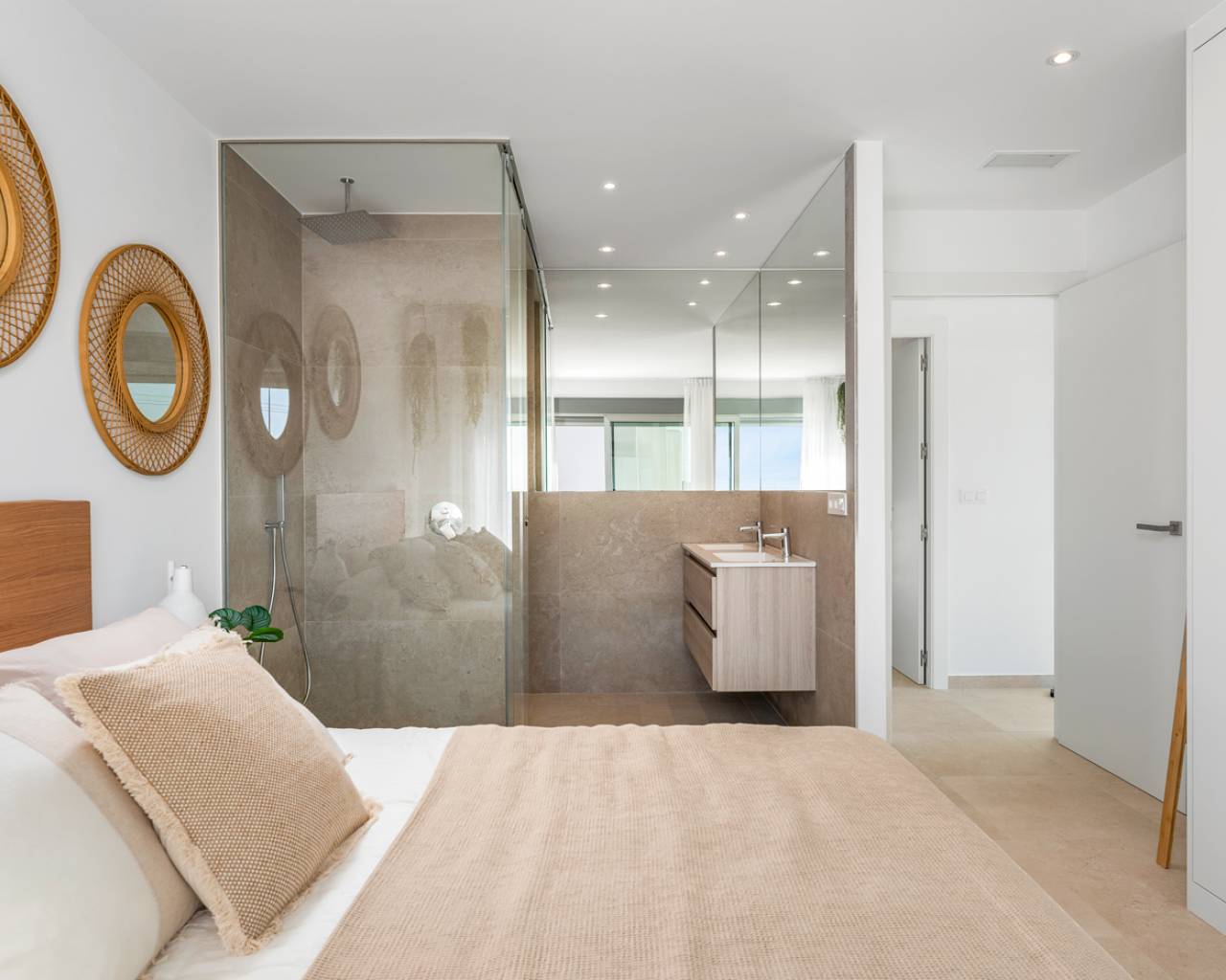 The properties feature an exterior design that maximizes enjoyment of the Mediterranean climate. Each home has a private garden, perfect for outdoor relaxation or family gatherings. The terrace is another standout space, ideal for enjoying the surroundings and leisure moments. Additionally, the homes offer the option of a solarium, providing additional space for sunbathing and enjoying panoramic views. The inclusion of a private pool in each property adds a touch of luxury, allowing for refreshing dips on the hottest days.