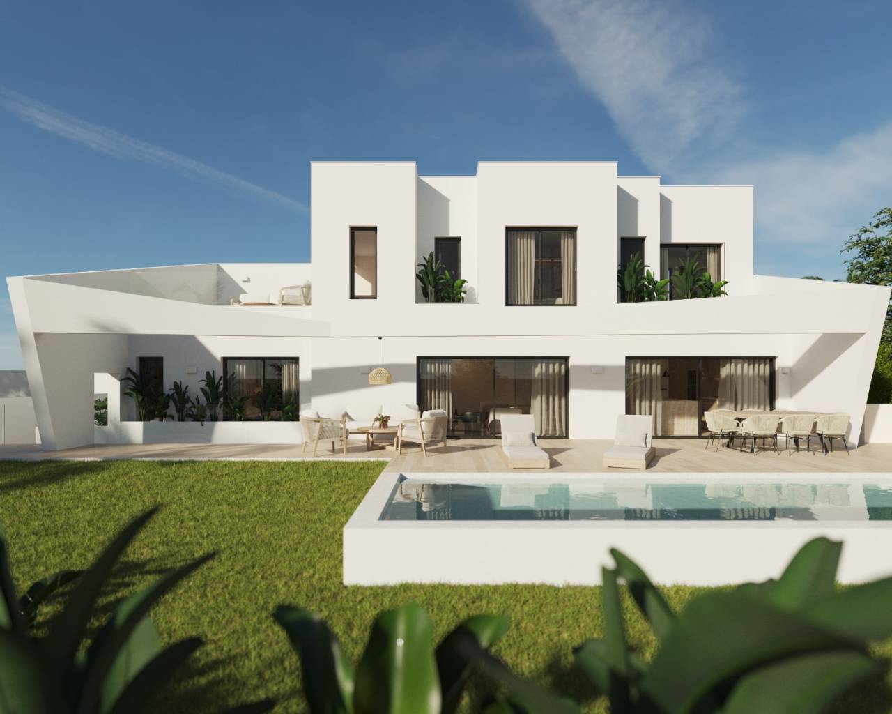 The outdoor areas of these homes are designed to enjoy the Mediterranean climate. Each property features a private garden, perfect for relaxing or enjoying outdoor activities. Additionally, they have a terrace and a solarium, ideal for sunbathing or enjoying the stunning sea views. The presence of a private pool in each home adds a touch of luxury, allowing residents to refresh and enjoy leisure moments in the comfort of their home.