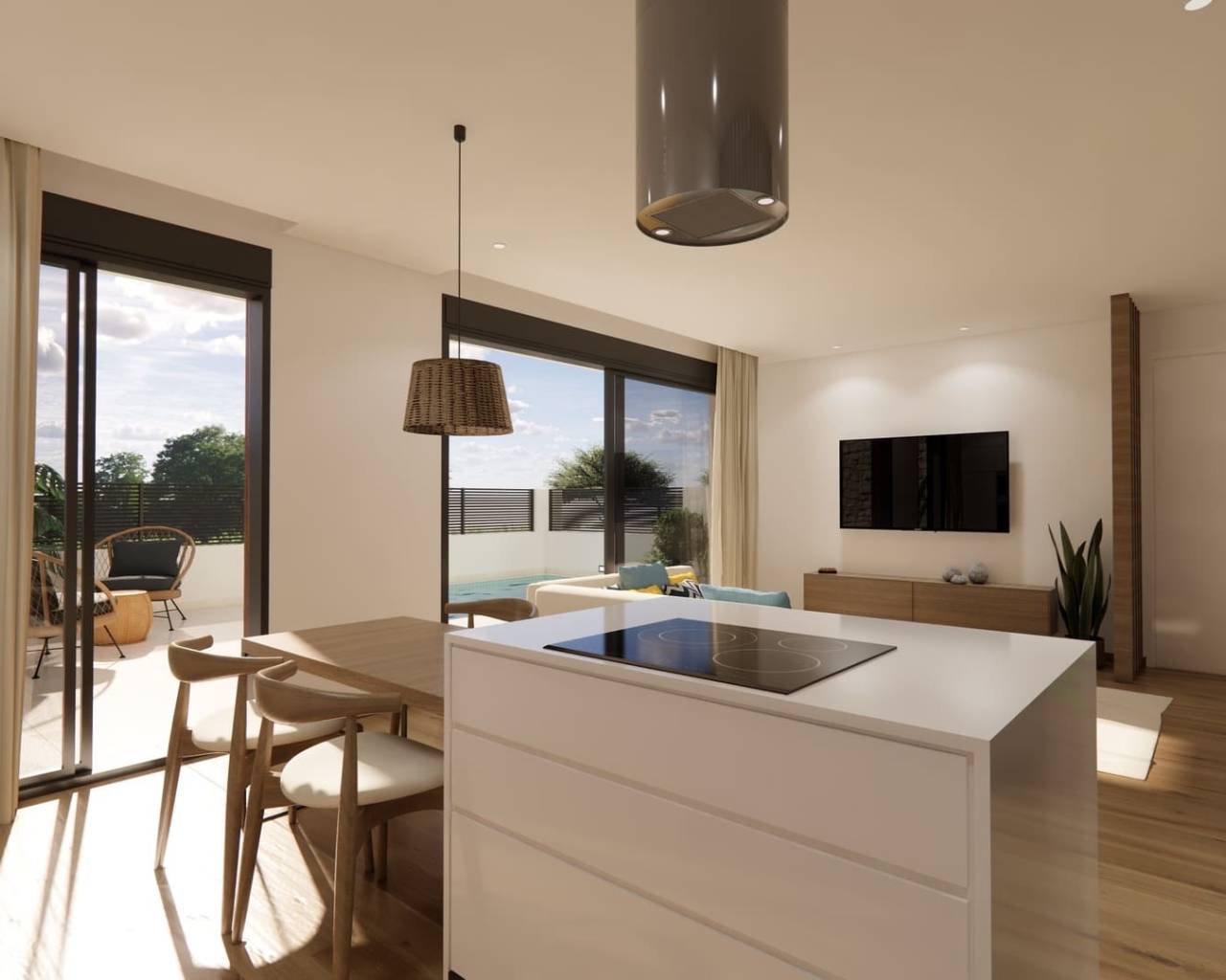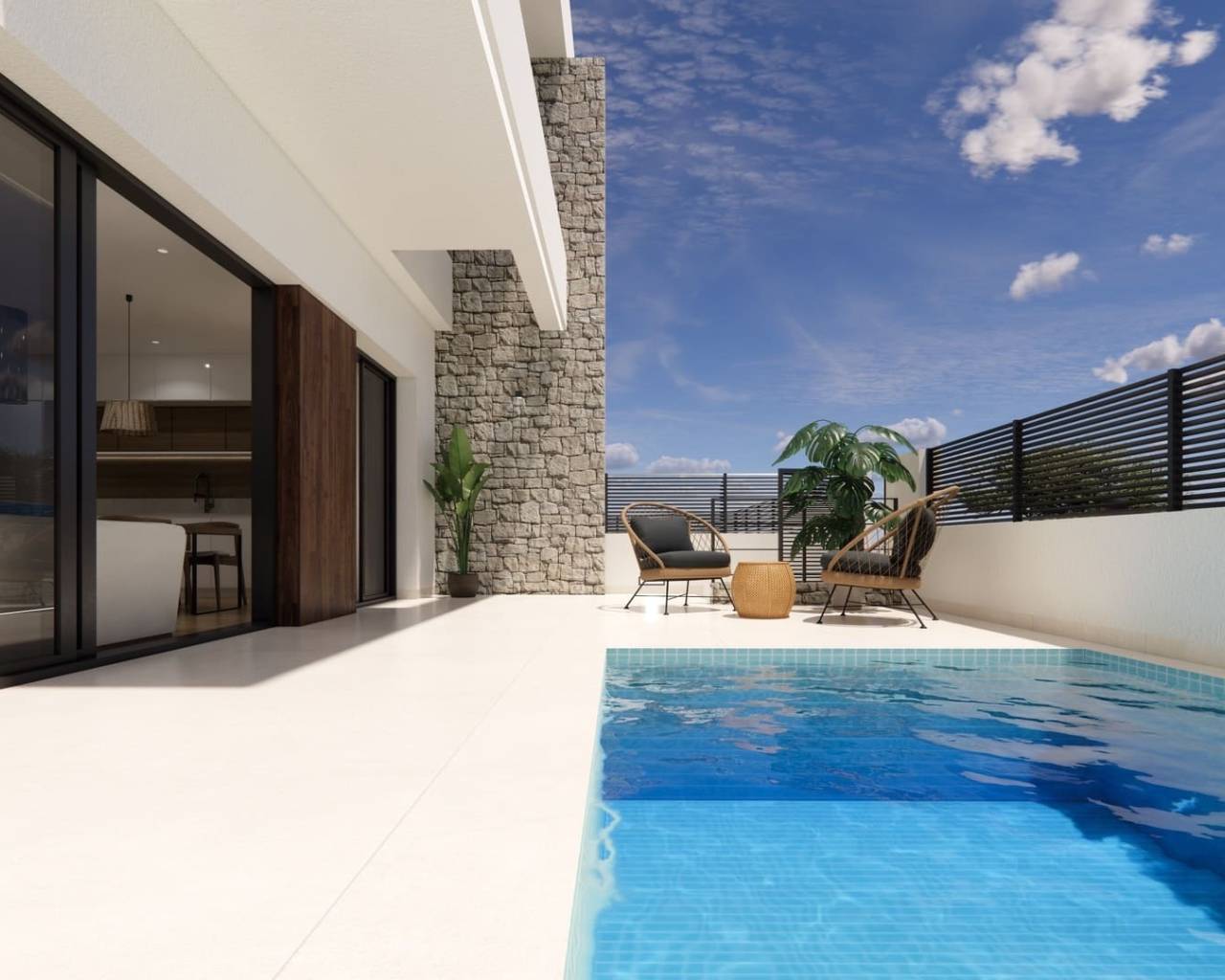 The exteriors of these townhouses have been carefully designed to offer a space for relaxation and outdoor enjoyment. Each property features a private terrace, perfect for outdoor dining or simply relaxing under the sun. Additionally, the inclusion of a private pool in each townhouse adds a touch of luxury and exclusivity, allowing for refreshing dips on hot summer days without leaving home. The exterior architecture combines modernity and functionality, harmoniously integrating with the natural surroundings of Dolores.