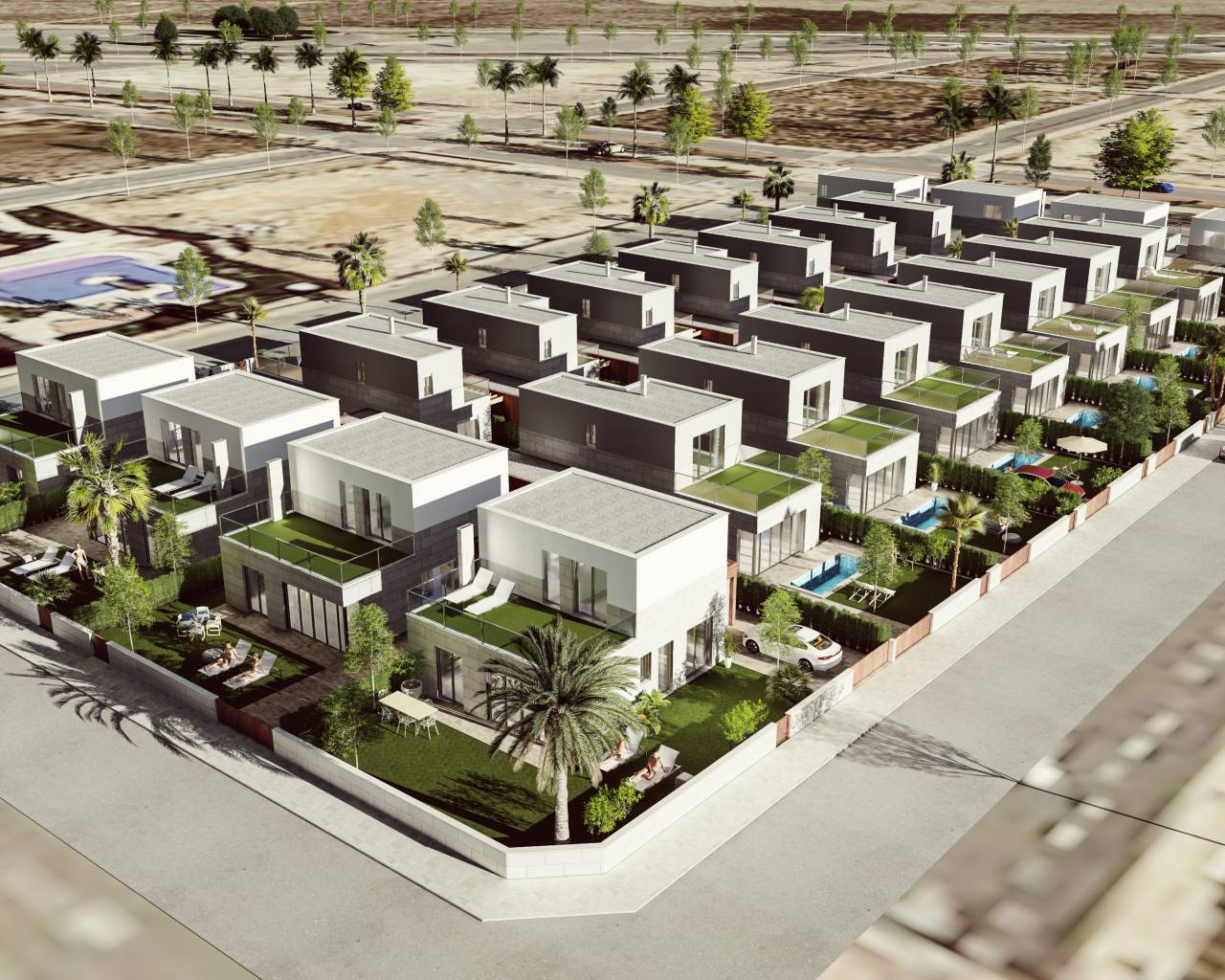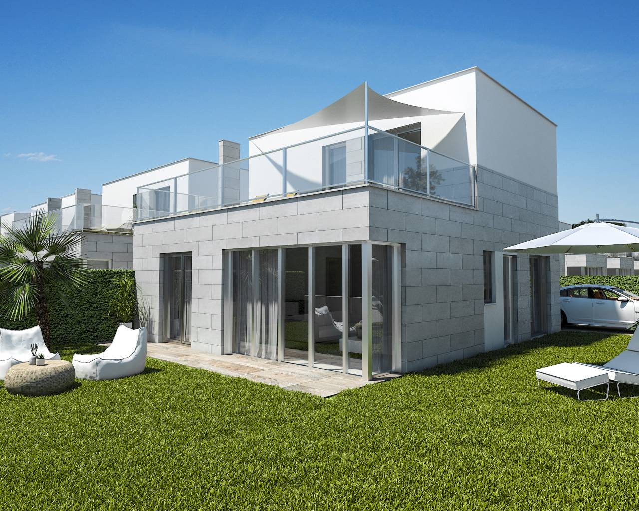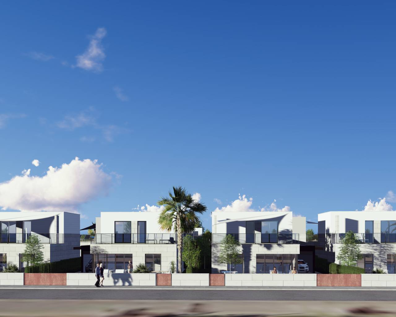The exterior design of these detached homes in Los Alcázares focuses on integration with the natural environment and providing outdoor spaces that maximize enjoyment of the Mediterranean climate. Each property features a private garden, perfect for creating a personal oasis of tranquility or for enjoying outdoor gatherings. The terrace, an essential element in these homes, offers additional space for relaxation or dining al fresco, while the solarium provides an ideal spot for sunbathing in complete privacy. Proximity to the sea, just 1 km away, allows for unobstructed views and the enjoyment of the sea breeze, making the outdoors a perfect place for rest and leisure.