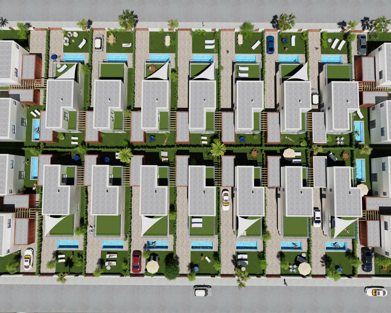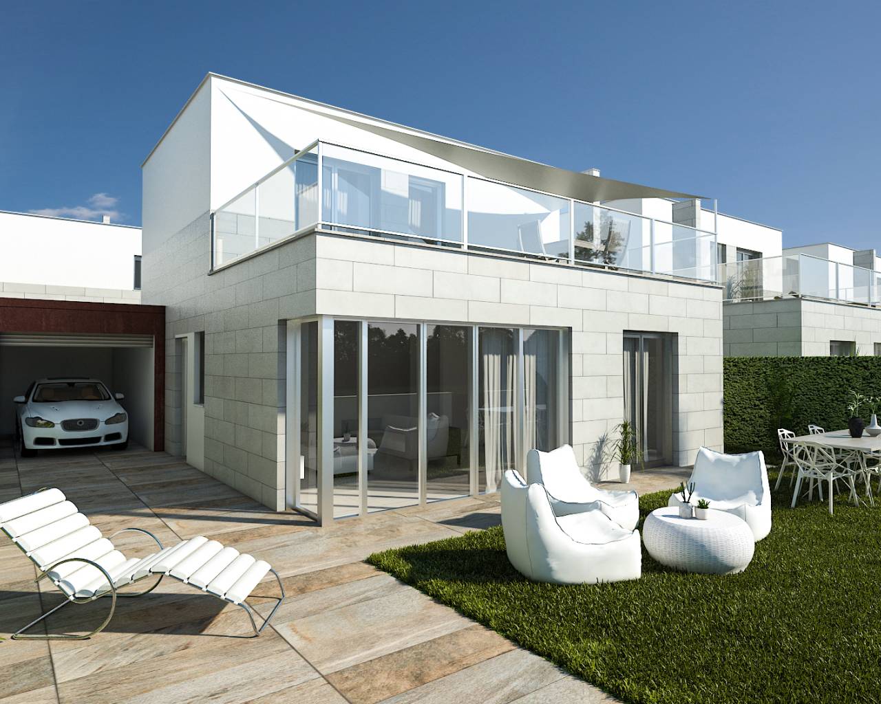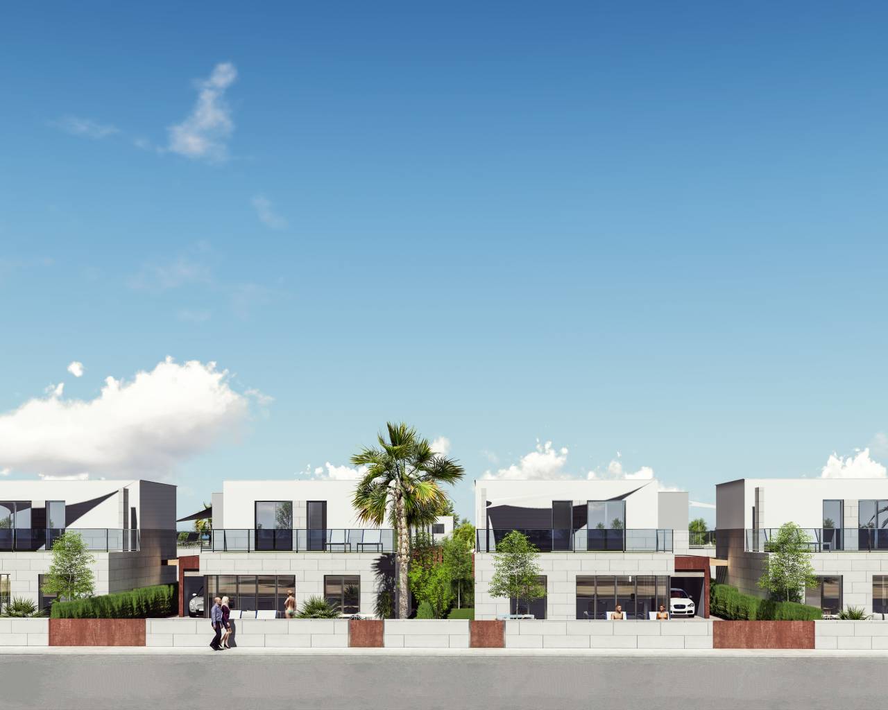 The exterior design of these detached homes in Los Alcázares focuses on integration with the natural environment and providing outdoor spaces that maximize enjoyment of the Mediterranean climate. Each property features a private garden, perfect for creating a personal oasis of tranquility or for enjoying outdoor gatherings. The terrace, an essential element in these homes, offers additional space for relaxation or dining al fresco, while the solarium provides an ideal spot for sunbathing in complete privacy. Proximity to the sea, just 1 km away, allows for unobstructed views and the enjoyment of the sea breeze, making the outdoors a perfect place for rest and leisure.