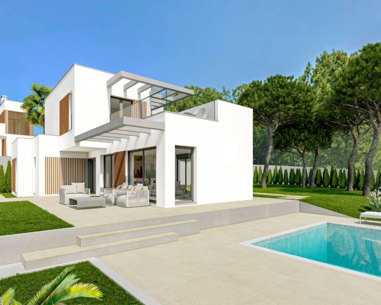 The exteriors of these homes stand out for their modern and functional design. Each villa features a private garden, perfect for enjoying the Mediterranean climate. The spacious terraces offer an ideal space to relax or entertain guests, while the pergola provides shade and style. Additionally, each property includes a private pool, allowing you to enjoy a refreshing swim in the comfort of your home. Access to a private garage ensures convenience and security for residents.