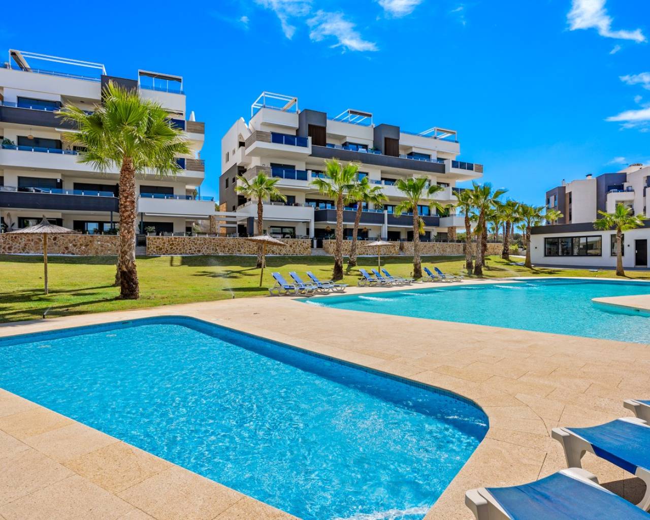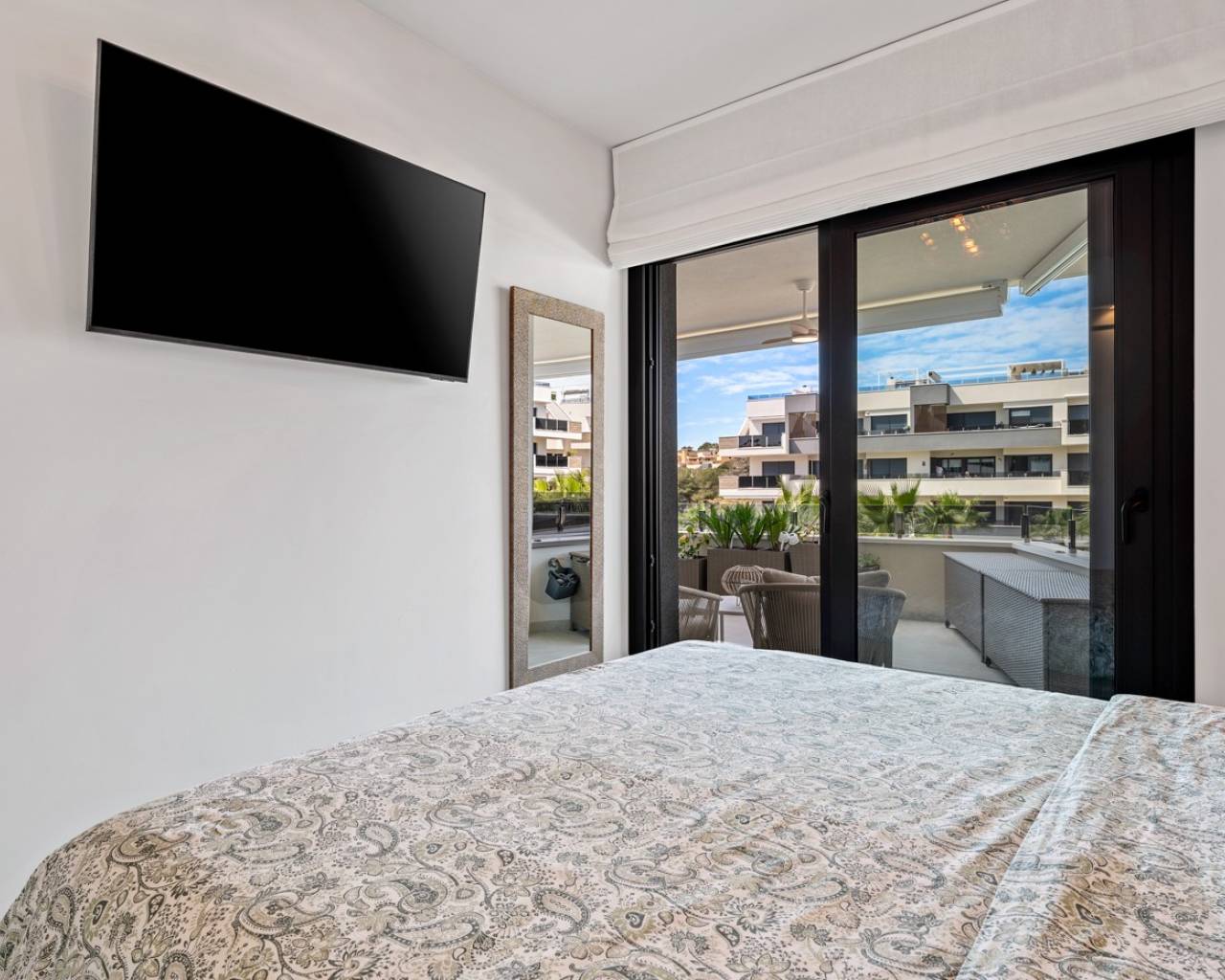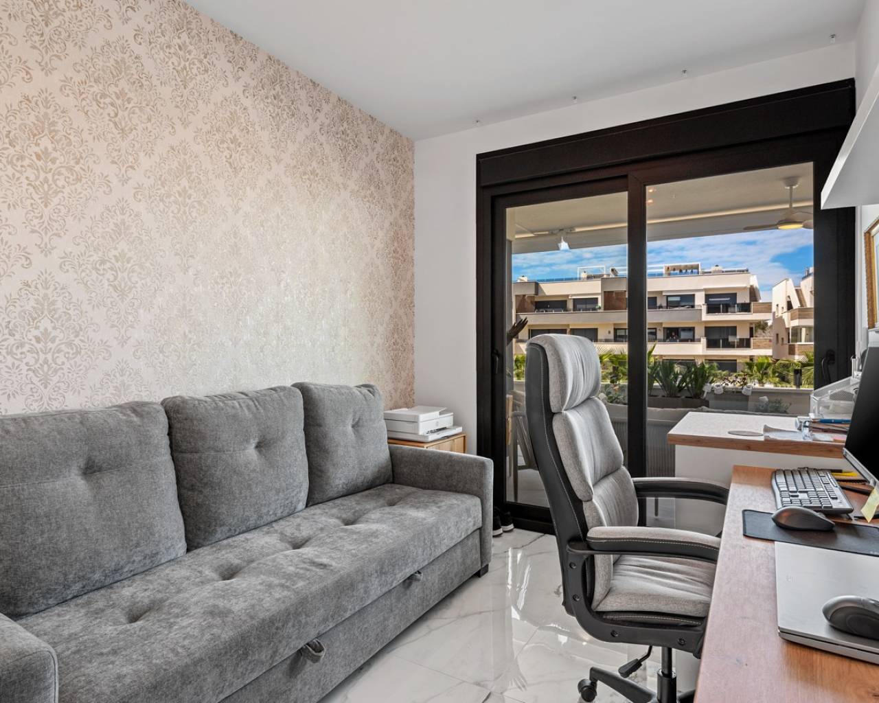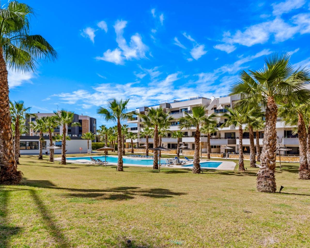 Luxury apartment in Resort Amanecer X, located in the popular area of Los Altos in Orihuela Costa. This stylish and contemporary apartment was completed in 2024 and represents an excellent opportunity as a holiday home, permanent residence, or investment with strong rental potential. The apartment features a bright, open-plan living room with kitchen and dining area, designed to maximize space and natural light. Large windows create an airy atmosphere and provide direct access to a spacious private terrace, seamlessly blending indoor and outdoor living. The kitchen is fully equipped with modern appliances and finished in a sleek, contemporary style that integrates perfectly with the living space. There are two spacious bedrooms, both with built-in wardrobes and located on the terrace side of the apartment, as well as two modern bathrooms finished to a high standard. The apartment is sold fully furnished and has a total surface area of 65 m², offering a practical and well-balanced layout. One of the standout features is the generous private terrace of over 25 m², overlooking the landscaped gardens and communal swimming pool. Thanks to its southwest orientation, the terrace enjoys excellent sun exposure, making it ideal for relaxing or outdoor dining. The apartment is located on the first floor of building number 8 with an elevator and includes an underground parking space and a private storage room. It is equipped with air conditioning, an Airzone climate control system, underfloor heating in the bathrooms, and electric shutters, ensuring year-round comfort. The property is in perfect condition, fully furnished, and ready to move in! Residents of Amanecer X enjoy a resort-style environment with access to a large communal swimming pool, a children’s pool, a fully equipped gym, as well as a jacuzzi and sauna. All of this is surrounded by beautifully maintained tropical gardens with adapted access for people with reduced mobility. The location is highly convenient: restaurants, cafés, and supermarkets are within walking distance, and La Zenia Boulevard is just a few minutes’ drive away. For golf enthusiasts, the area offers a wide selection of nearby courses, including Villamartín Golf just 5 minutes away, Real Club de Golf Campoamor and Las Ramblas Golf within approximately 10 minutes, and the prestigious Las Colinas Golf & Country Club about 15 minutes from the apartment. The sandy beaches of Orihuela Costa, such as La Zenia Beach, Playa Flamenca, Cabo Roig, and Campoamor, are all within a 10-minute drive. The apartment is ideally located between two major airports, offering excellent connections: Alicante Airport is approximately 45 minutes away, and Murcia International Airport is around 35 to 40 minutes by car.