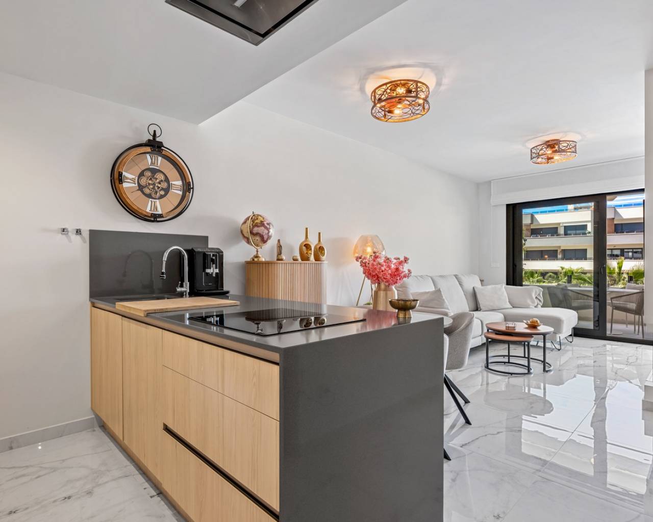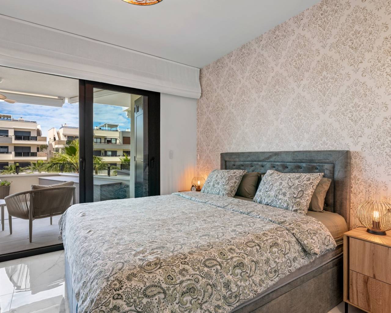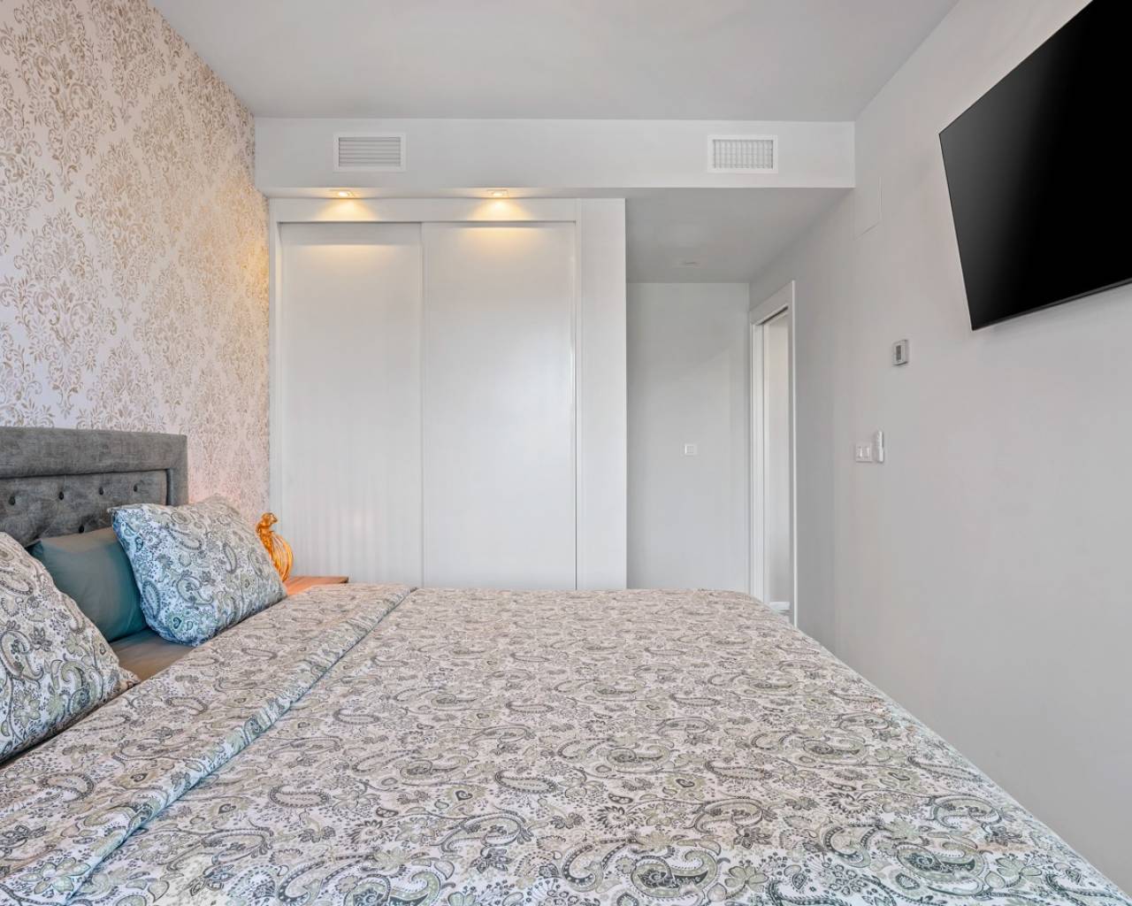 Luxury apartment in Resort Amanecer X, located in the popular area of Los Altos in Orihuela Costa. This stylish and contemporary apartment was completed in 2024 and represents an excellent opportunity as a holiday home, permanent residence, or investment with strong rental potential. The apartment features a bright, open-plan living room with kitchen and dining area, designed to maximize space and natural light. Large windows create an airy atmosphere and provide direct access to a spacious private terrace, seamlessly blending indoor and outdoor living. The kitchen is fully equipped with modern appliances and finished in a sleek, contemporary style that integrates perfectly with the living space. There are two spacious bedrooms, both with built-in wardrobes and located on the terrace side of the apartment, as well as two modern bathrooms finished to a high standard. The apartment is sold fully furnished and has a total surface area of 65 m², offering a practical and well-balanced layout. One of the standout features is the generous private terrace of over 25 m², overlooking the landscaped gardens and communal swimming pool. Thanks to its southwest orientation, the terrace enjoys excellent sun exposure, making it ideal for relaxing or outdoor dining. The apartment is located on the first floor of building number 8 with an elevator and includes an underground parking space and a private storage room. It is equipped with air conditioning, an Airzone climate control system, underfloor heating in the bathrooms, and electric shutters, ensuring year-round comfort. The property is in perfect condition, fully furnished, and ready to move in! Residents of Amanecer X enjoy a resort-style environment with access to a large communal swimming pool, a children’s pool, a fully equipped gym, as well as a jacuzzi and sauna. All of this is surrounded by beautifully maintained tropical gardens with adapted access for people with reduced mobility. The location is highly convenient: restaurants, cafés, and supermarkets are within walking distance, and La Zenia Boulevard is just a few minutes’ drive away. For golf enthusiasts, the area offers a wide selection of nearby courses, including Villamartín Golf just 5 minutes away, Real Club de Golf Campoamor and Las Ramblas Golf within approximately 10 minutes, and the prestigious Las Colinas Golf & Country Club about 15 minutes from the apartment. The sandy beaches of Orihuela Costa, such as La Zenia Beach, Playa Flamenca, Cabo Roig, and Campoamor, are all within a 10-minute drive. The apartment is ideally located between two major airports, offering excellent connections: Alicante Airport is approximately 45 minutes away, and Murcia International Airport is around 35 to 40 minutes by car.