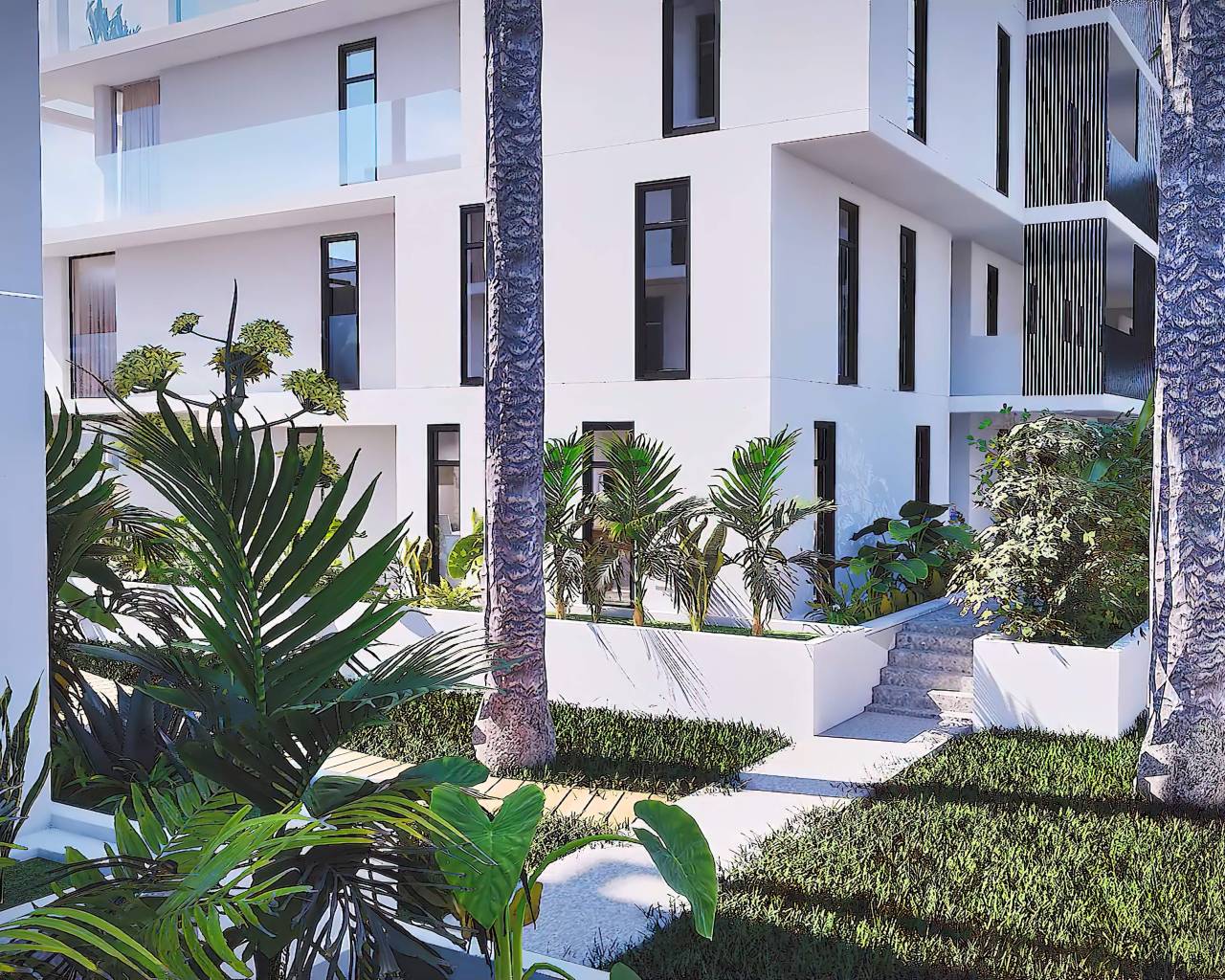 The exteriors of these homes are designed to maximize enjoyment of the Mediterranean climate. Each property features a private terrace, perfect for outdoor relaxation or al fresco dining. The ground floors have private gardens, offering additional space for leisure or gardening. Additionally, the penthouses include a solarium, providing an exclusive place for sunbathing with total privacy. Proximity to the sea, just 400 meters away, allows for coastal walks and water activities.